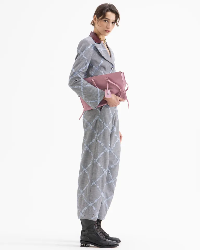 Pantalón con diseño de rombos formados por bordados, con cintura que integra un efecto de cinto. Presenta cierre con gancho, cierre y botón interno para ajuste seguro. Su diseño incluye pinzas en la zona de la rodilla, bolsillos biselados con detalles en contraste y bolsillos ojal en la parte posterior.