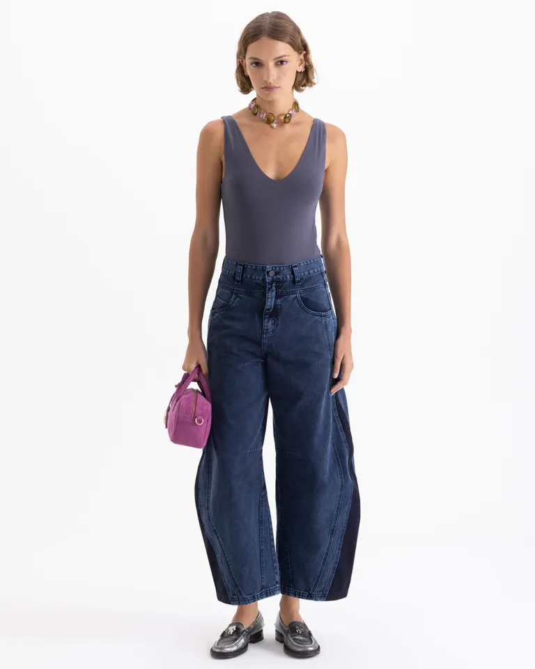 Pantalón de calce slouchy con tiro medio y largo al tobillo. Su diseño destaca por sus pinzas internas en las rodillas y recortes curvos que aportan volumen. Con lavados que crean contrastes sutiles, incluye bordado distintivo en la parte trasera. Una prenda versátil para el uso diario con un estilo moderno y estructurado, ideal para lograr conjuntos casuales y elegantes en cualquier ocasión.