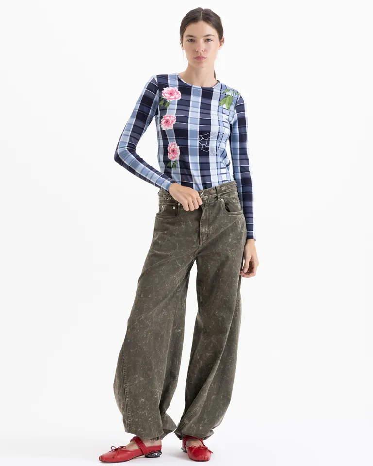 Pantalón de tiro medio con calce holgado y pierna ancha. Presenta un estilo relajado con cinco bolsillos tradicionales, cierre con botón y presillas en la cintura para un ajuste cómodo. Su diseño incorpora un acabado desgastado que aporta textura, ideal para outfits cotidianos. Una prenda versátil y funcional para renovar tus conjuntos diarios con un calce amplio y moderno.