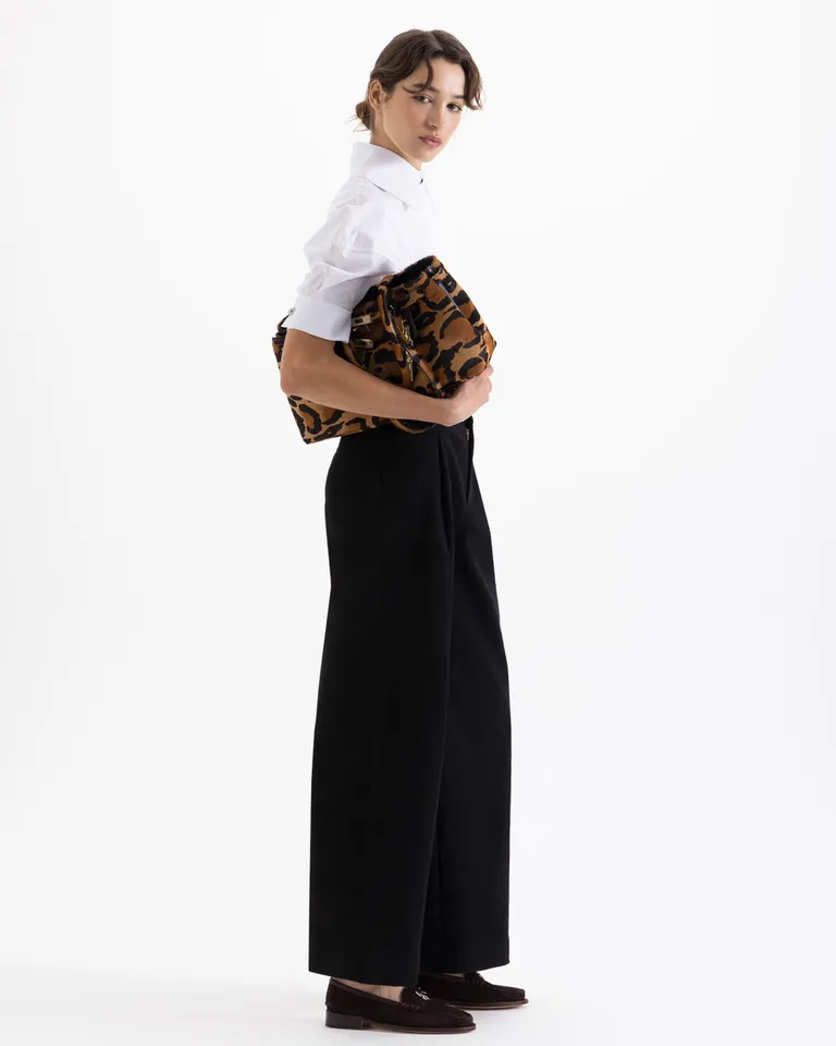 Pantalón de largo completo con silueta wide leg y tablas en la cintura delantera que brindan una caída fluida. Cuenta con cierre metálico, ganchos pantaloneros y presillas en la cintura con broches snap. Incluye bolsillos funcionales tanto en el frente como en el posterior, siendo una prenda versátil para diversas ocasiones.