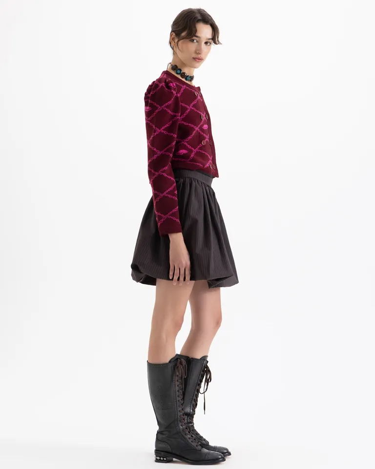 Pollera corta con diseño de volumen tipo balloon, cuenta con ajuste en la cintura y largo sobre la rodilla. Es una prenda versátil ideal para combinar con botas altas o zapatos de vestir, aportando estructura y movimiento a cualquier conjunto diario.