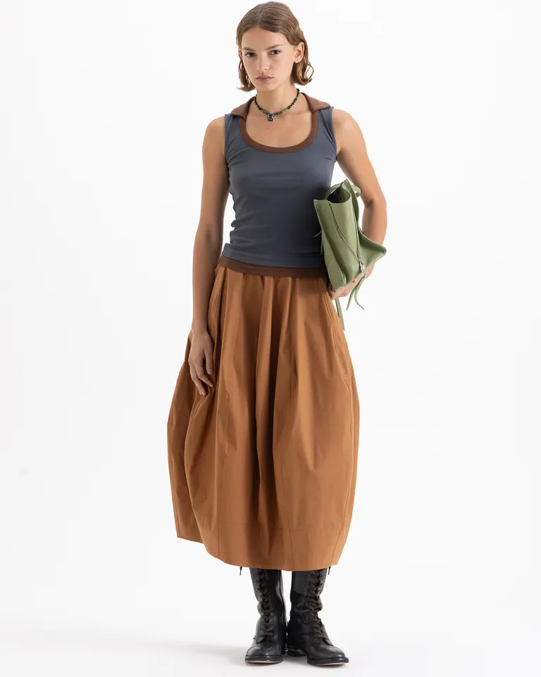 Pollera larga de diseño tipo balloon. Presenta una silueta voluminosa y estructurada con recortes verticales en el delantero y la espalda. Incluye bolsillos funcionales ocultos en los laterales y detalle de bordado sutil en el frente. Una prenda versátil para sumar estilo a tus conjuntos diarios.