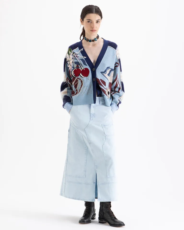 Pollera midi con tajo frontal que brinda mayor movilidad y comodidad. Presenta detalles de costuras visibles y bolsillos que realzan un estilo funcional y urbano. Posee una estructura interna en la cintura y un diseño clásico que se adapta a diversas ocasiones, siendo una prenda versátil para combinar con diferentes tipos de calzado y partes superiores.