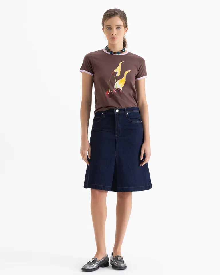 Pollera midi en denim de lavado oscuro. Presenta un corte con tabla central en el frente, brindando un calce cómodo y una silueta sutilmente acampanada que sigue el movimiento natural del cuerpo. Un diseño versátil y atemporal ideal para completar diversos outfits casuales o formales, adaptándose a diferentes ocasiones con estilo.