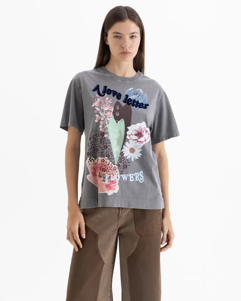 Remera de corte clásico con cuello redondo y mangas cortas, presenta un diseño con estampa frontal y detalles bordados. Ideal para combinar con diversas prendas, esta prenda básica ofrece un calce cómodo y versátil para el día a día, adaptándose a múltiples estilos.