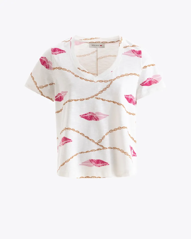 Remera de corte clásico con cuello en v y terminación curva en el ruedo. Presenta un diseño distintivo con motivos de labios y cadenas. Una opción versátil y fresca para complementar looks casuales de uso diario.