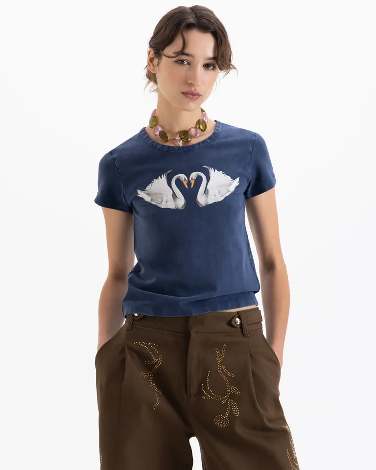Remera de corte entallado con cuello redondo y mangas cortas. Presenta un diseño gráfico de cisnes en el frente y detalle bordado en la espalda, ideal para combinar en looks urbanos y modernos. Su formato al cuerpo brinda una silueta estilizada y versátil para el día a día.