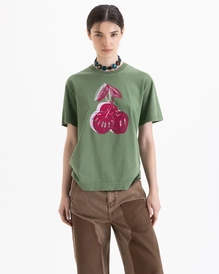 Remera de corte holgado y diseño casual con cuello redondo y mangas cortas. Presenta un detalle estampado en la parte frontal central que le brinda un toque distintivo. Ideal para lograr un estilo relajado y versátil en el uso diario, combinable con diversas prendas inferiores gracias a su calce cómodo y largo a la cadera.