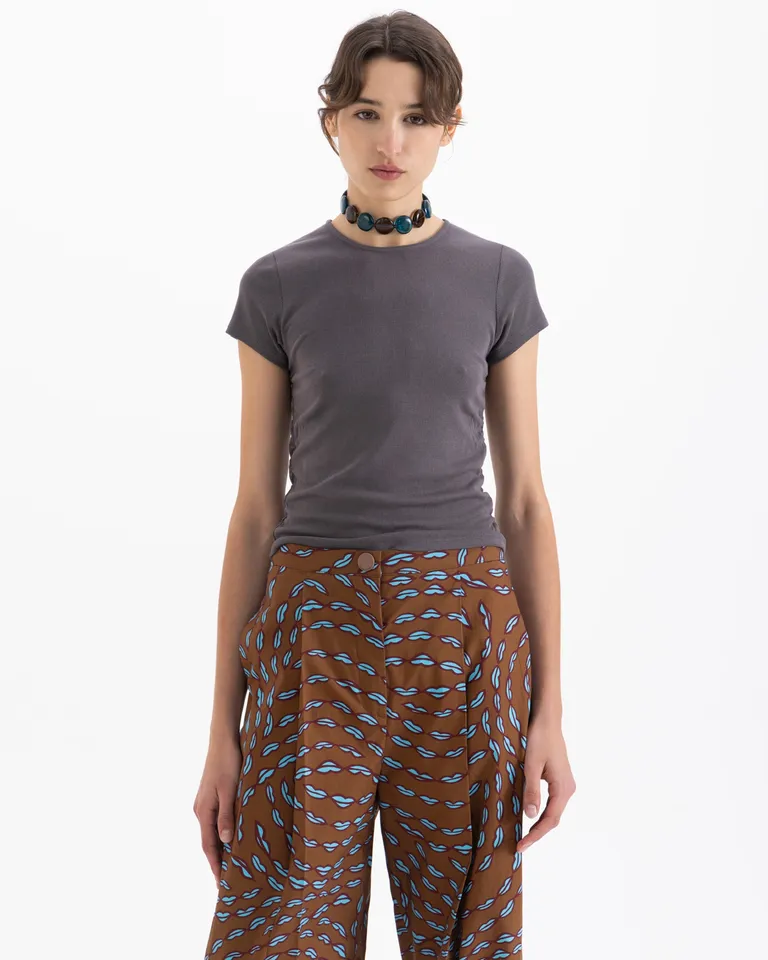 Remera de corte clásico con cuello redondo y mangas cortas, diseñada con un ajuste entallado y detalle de frunces en los laterales. Una prenda versátil ideal para integrar en conjuntos cotidianos.