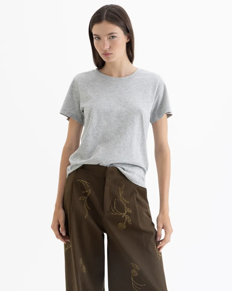 Remera de corte clásico y líneas simples con mangas cortas y cuello redondo. Presenta un diseño versátil de calce holgado, ideal para combinar en diversos conjuntos. Incluye detalle distintivo en la parte posterior, ofreciendo un estilo funcional y cómodo para el día a día.