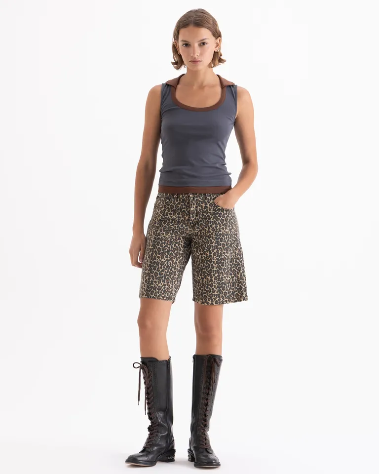 Short tipo bermuda con diseño estampado, confeccionado con un ajuste cómodo. Presenta terminaciones deshilachadas en el ruedo y un diseño versátil para combinar en cualquier ocasión. Ideal para un look casual y relajado con un toque distintivo.