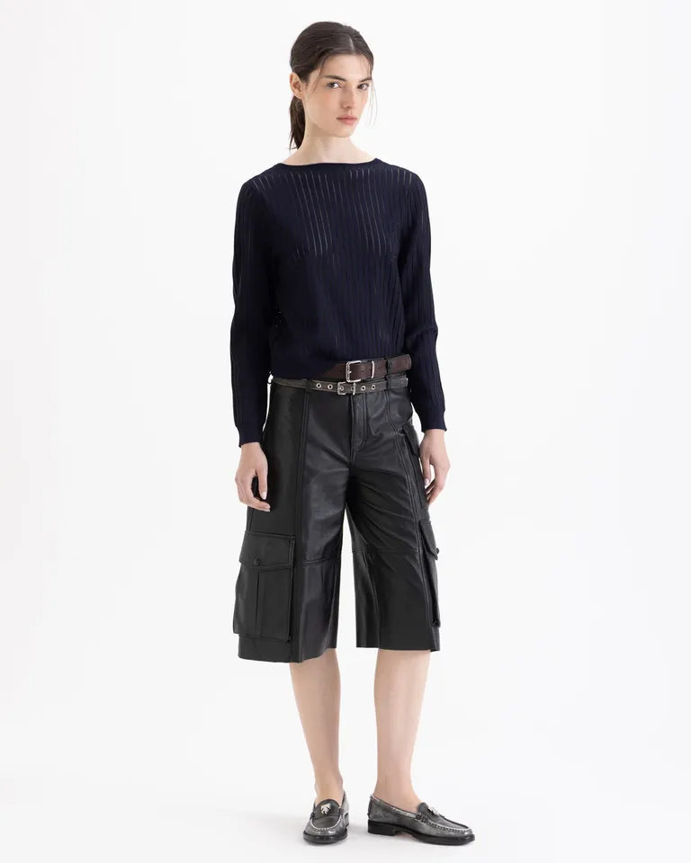 Sweater tejido con diseño de rayas y detalle de transparencias. Presenta un escote pronunciado en la parte posterior y un corte que llega a la altura de la primera cadera. Ideal para integrar en equipos modernos y versátiles de uso diario.