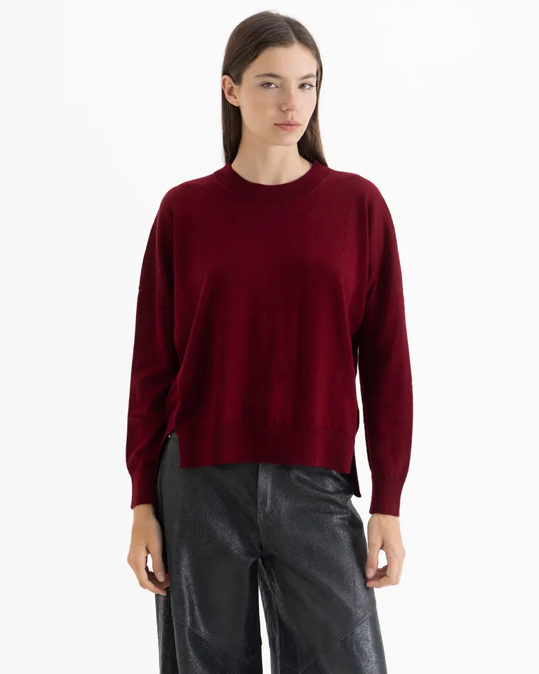 Sumá a tu guardarropa este sweater básico de cuello redondo. Presenta un diseño de calce holgado, con mangas largas y un corte ligeramente más corto en el frente, ideal para combinar en cualquier ocasión. Su estilo versátil lo convierte en una prenda esencial para lograr outfits relajados y cómodos en toda temporada.