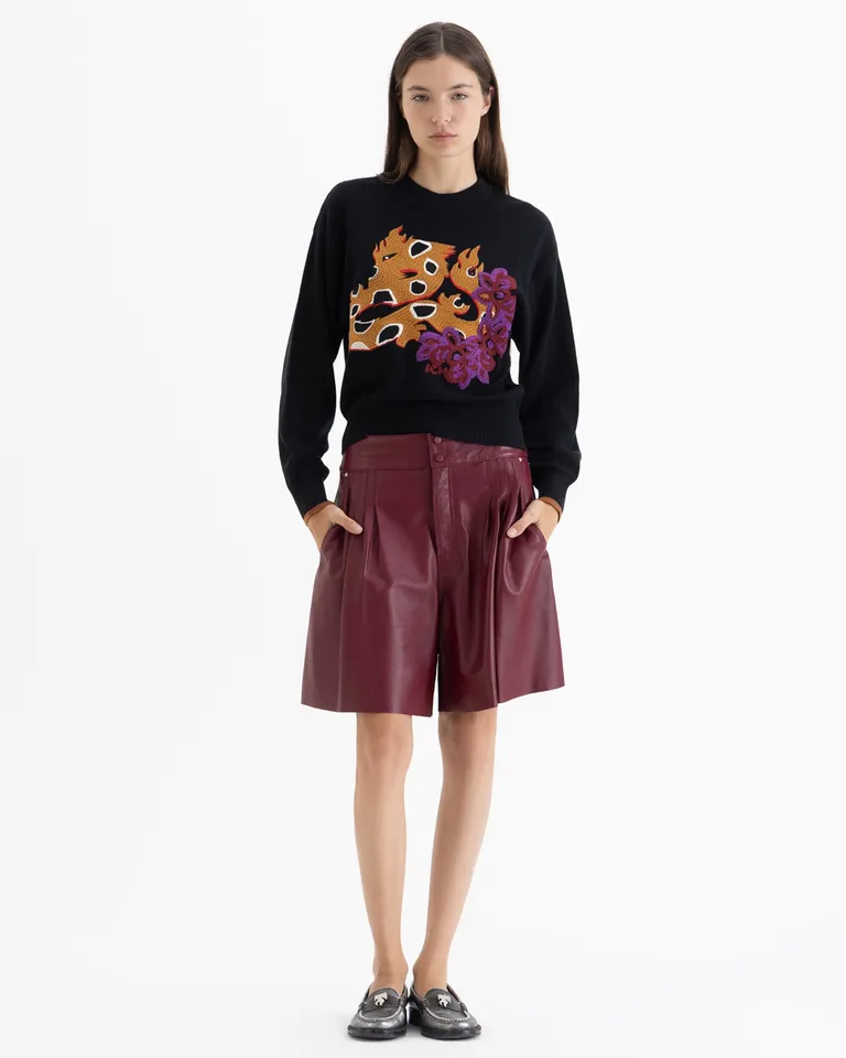 Sweater de tejido con corte a la altura de la cadera, diseñado con mangas largas y un detalle bordado distintivo en la parte frontal. Una prenda versátil para usar en distintas ocasiones aportando un toque personal a tus conjuntos diarios, manteniendo una silueta clásica y cómoda.