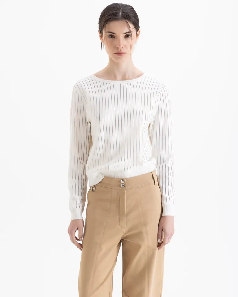 Sweater tejido con diseño de rayas verticales que presenta sutiles transparencias, escote profundo en la espalda y largo a la altura de la cadera. Una prenda versátil ideal para combinar en looks casuales y urbanos durante toda la temporada.