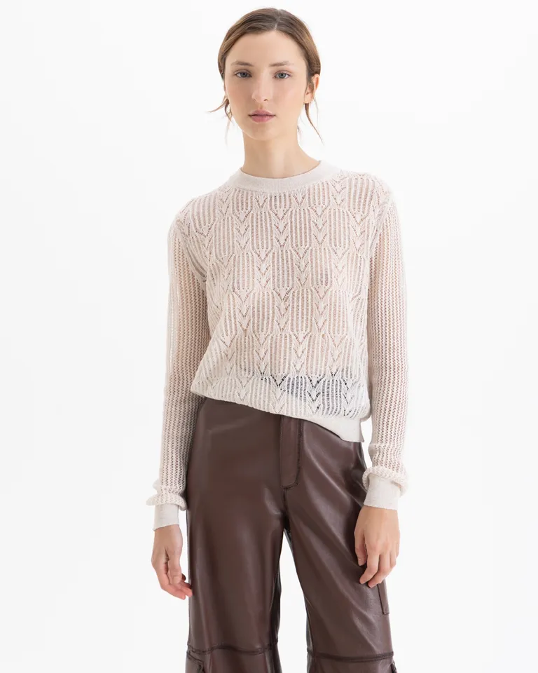 Sweater de manga larga con diseño tejido calado que aporta textura a la prenda. Presenta una silueta clásica de cuello redondo, ideal para combinar en diversos outfits diarios con estilo propio.