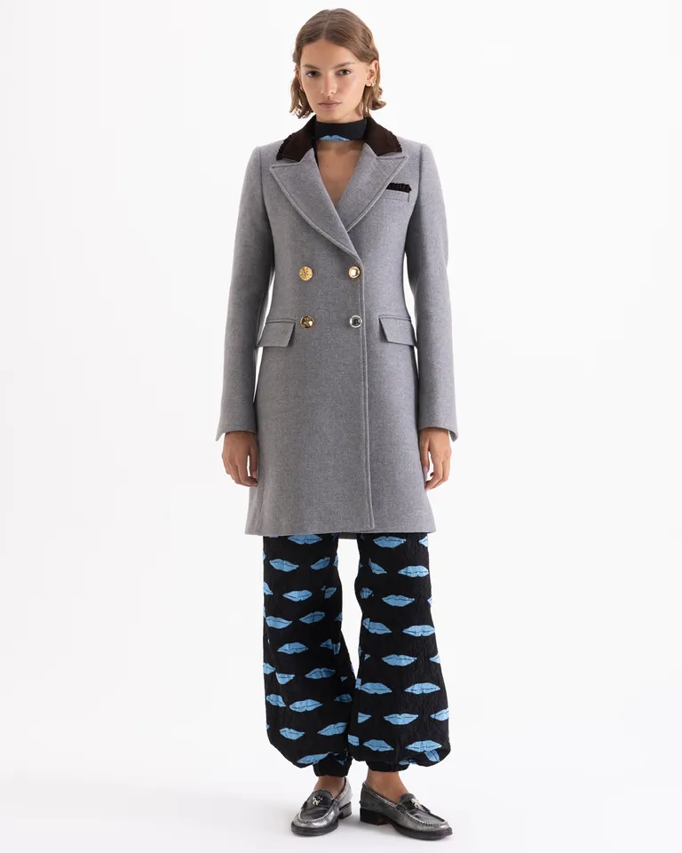 Tapado de corte sastrero con diseño cruzado, botones metálicos y detalles de contraste en el cuello. Presenta una silueta entallada y largo a la altura de la rodilla, ideal para complementar conjuntos urbanos con un estilo sofisticado. Posee solapas marcadas y bolsillos con tapa en el frente, ofreciendo una opción funcional y versátil para el día a día.