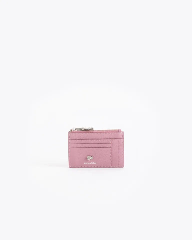 Tarjetero de diseño compacto, ideal para organizar tarjetas con estilo y practicidad. Cuenta con ranuras dedicadas y un cierre superior para mayor seguridad. Presenta un aplique metálico decorativo en el frente que aporta un toque distintivo al accesorio.