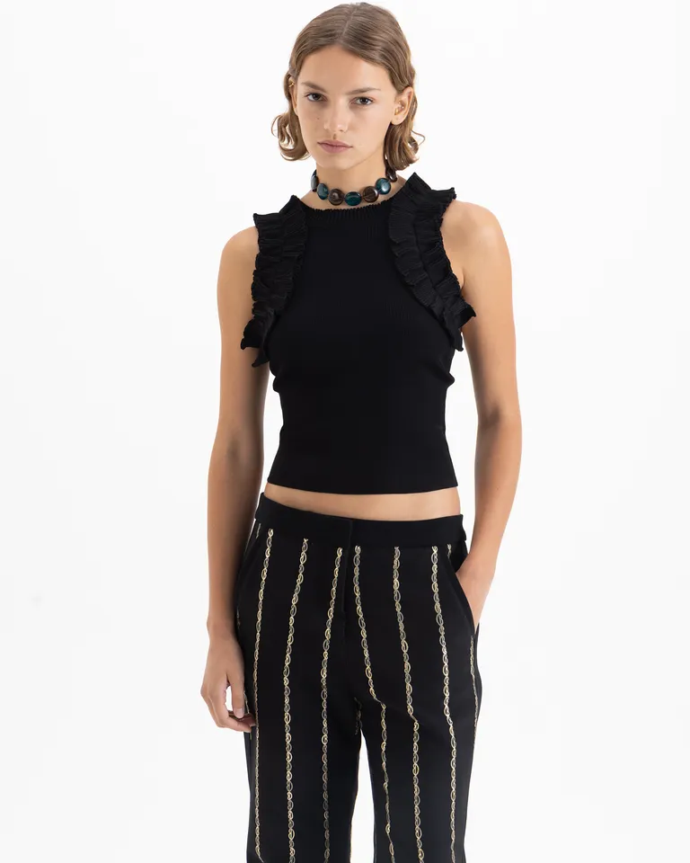 Top de calce ajustado al cuerpo con diseño que llega a la altura de la cintura. Presenta un detalle de volados en las sisas que brindan un toque distintivo. Es una prenda versátil, ideal tanto para usar como pieza principal o como parte de conjuntos en capas.