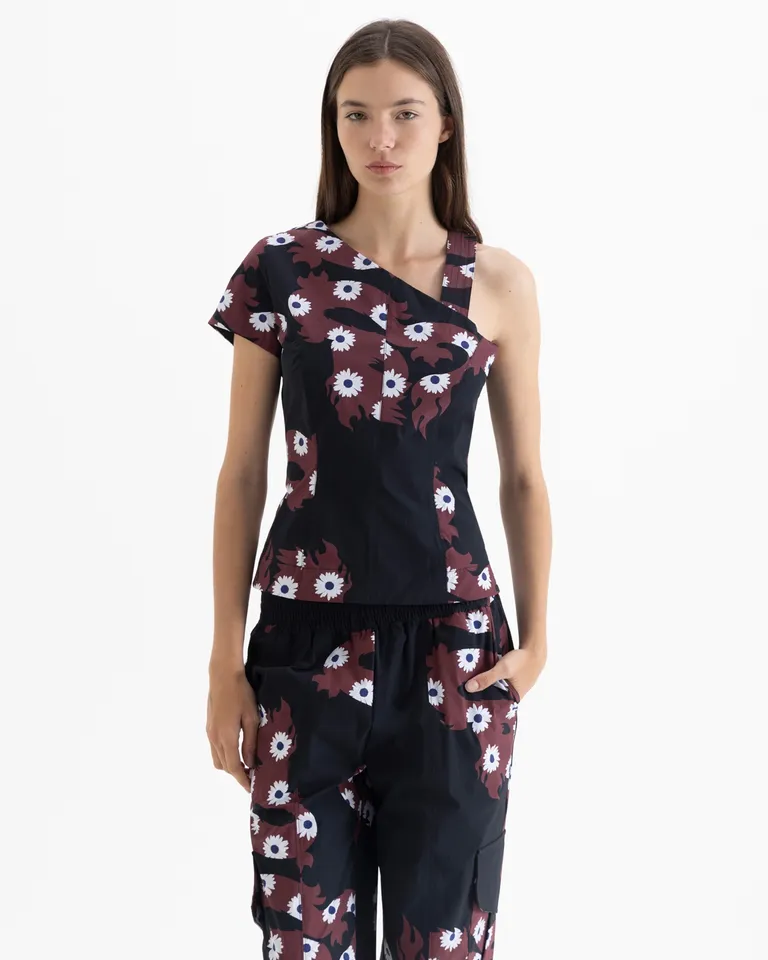 Top con diseño asimétrico que combina una manga corta y un bretel fino, logrando una silueta única al hombro. Presenta un diseño integral con motivos botánicos y figuras estilizadas que cubren toda la prenda. Es una pieza versátil para integrar en diversos conjuntos casuales o urbanos, ofreciendo un ajuste cómodo y moderno.