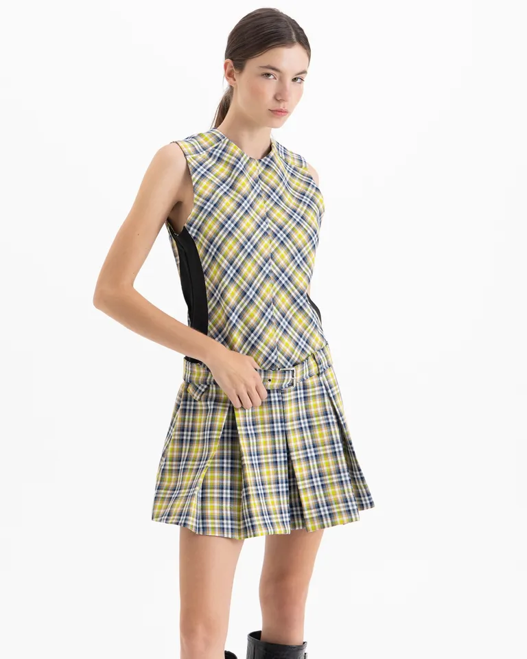 Vestido corto con diseño de tablas en la parte inferior y silueta ajustada en la parte superior. Presenta un estampado de cuadros clásicos con detalles de cinturón integrado que define la cintura y un cierre discreto en la espalda para un ajuste cómodo. Ideal para complementar con botas o calzado de caña alta.