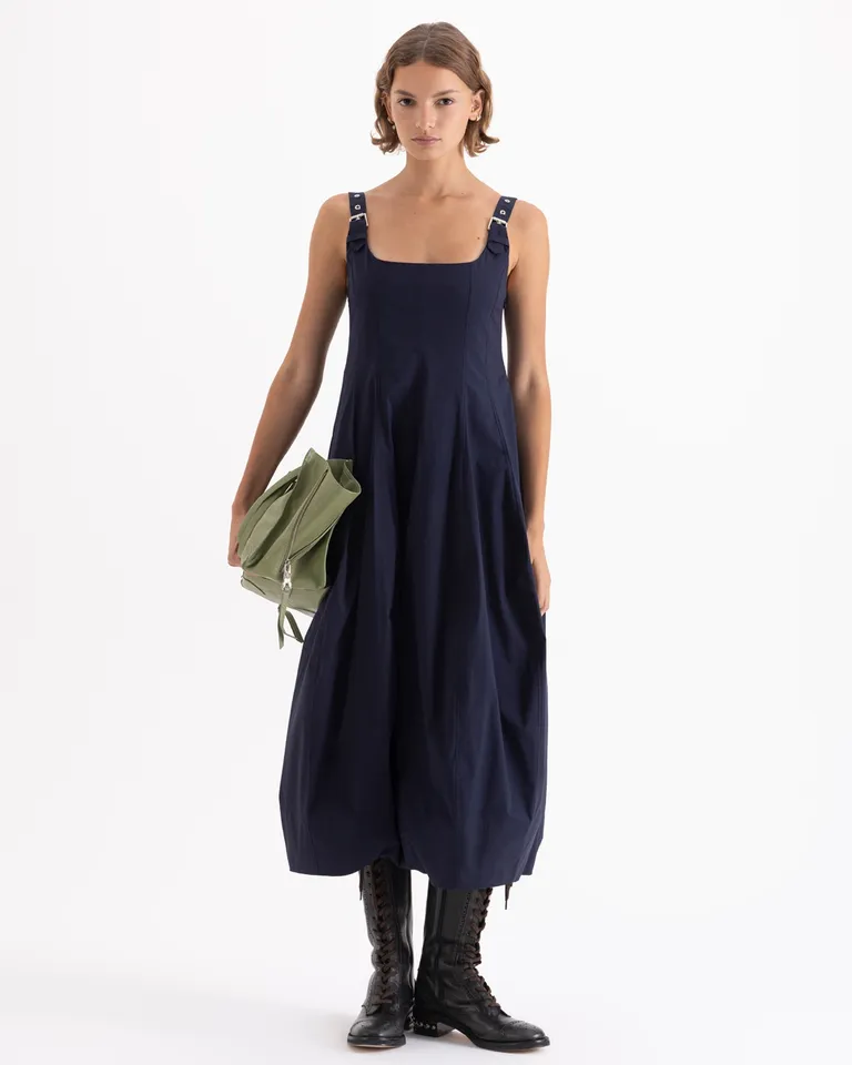 Vestido midi con diseño de falda tipo balloon, escote cuadrado y breteles regulables con detalles metálicos. Presenta un estilo versátil con bolsillos laterales ocultos y cierre lateral invisible para mayor comodidad. Una prenda esencial con caída estructurada, ideal para lograr un look femenino y funcional en cualquier ocasión.