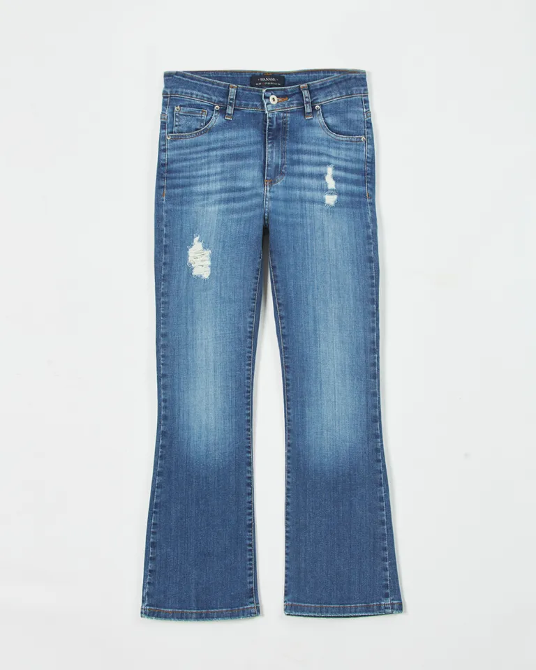 Jeans de corte boot cut en acabado deslavado con efecto usado para mujer de Wanama