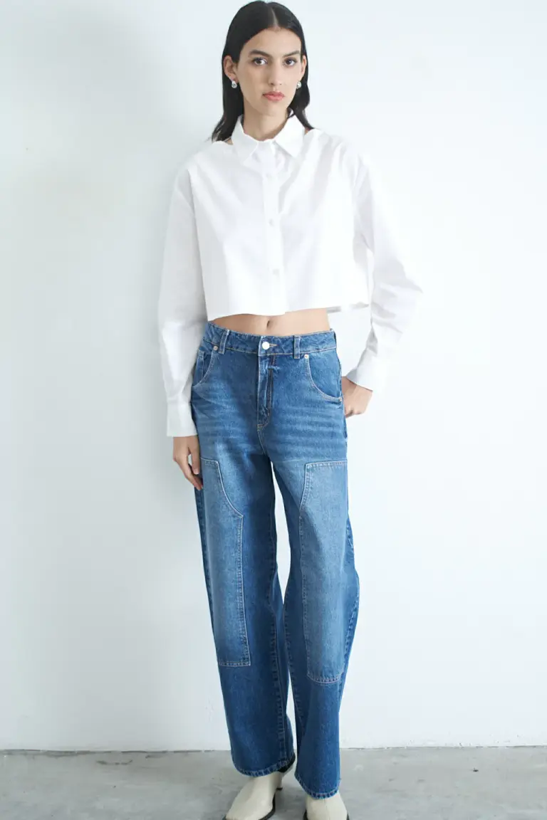 Pantalón de jean de pierna ancha, confeccionado en denim rígido con detalles de recorte en la parte delantera y lavado azul. Cierre con botón y remaches en zamac. Disponible en tallas 34, 36, 38, 40 y 42. Prenda versátil y cómoda para un look casual y moderno.