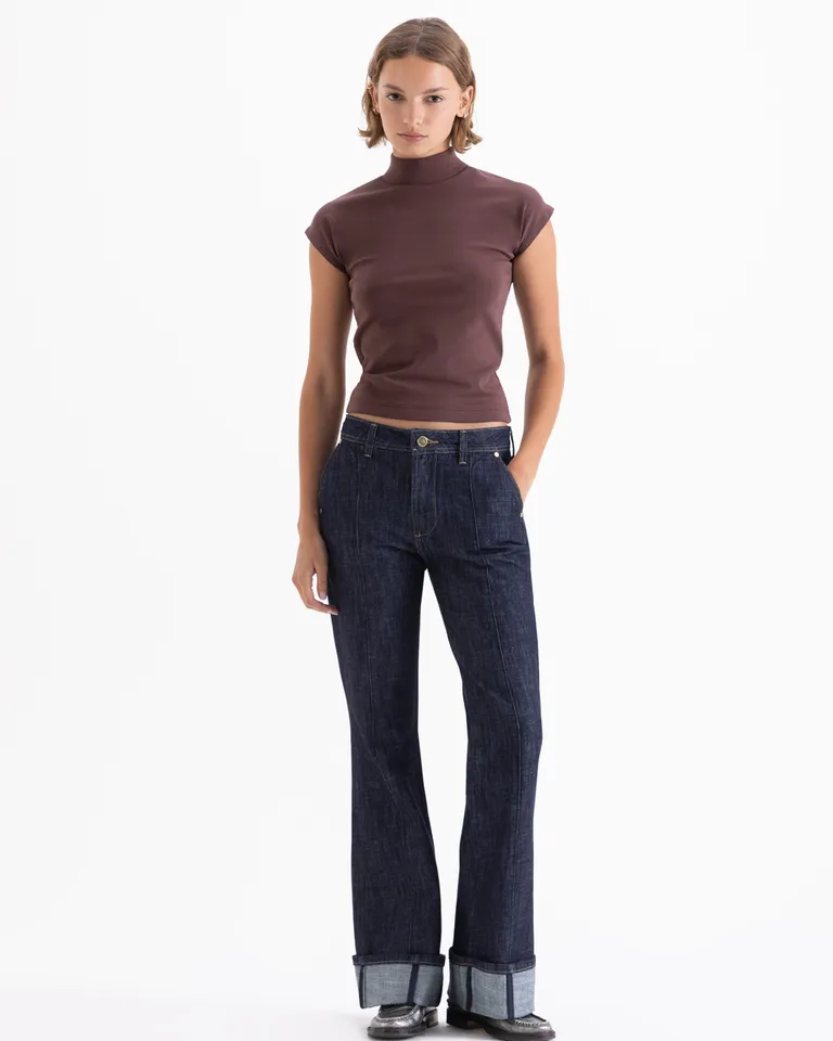 Estos modernos jeans de corte relajado y tiro medio son perfectos para lucir un estilo casual y cómodo durante el verano. Su diseño desestructurado y la basta enrollada en la bota le aportan un toque fresco y actual a cualquier atuendo.