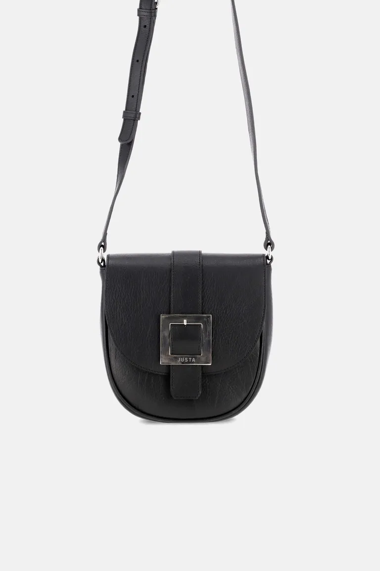 Bandolera de diseño clásico con formato redondeado, correa ajustable para el hombro y cierre frontal mediante hebilla metálica personalizada. Incluye bolsillo interno funcional y forro interno a tono. Un accesorio versátil ideal para completar looks diarios, ofreciendo comodidad y organización para llevar tus objetos personales con estilo.