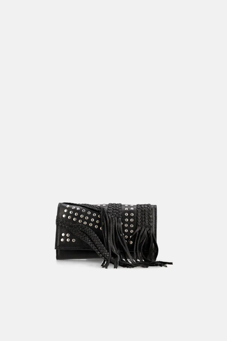 Billetera de diseño rectangular con detalle de flecos, terminaciones trenzadas y apliques de remaches metálicos. Un accesorio funcional y práctico con solapa frontal, ideal para organizar elementos personales en el uso diario con un estilo distintivo.