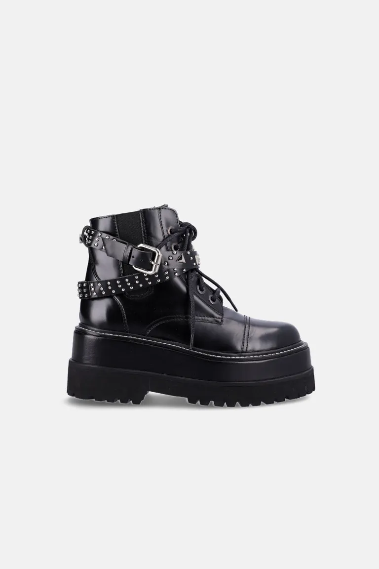 Borcego de estilo urbano con plataforma alta y suela track. Presenta cordones, caña media y tiras ajustables con hebillas metálicas y apliques de tachas. Un diseño robusto y estructurado con acabado brillante, ideal para complementar outfits con un toque industrial y alternativo.