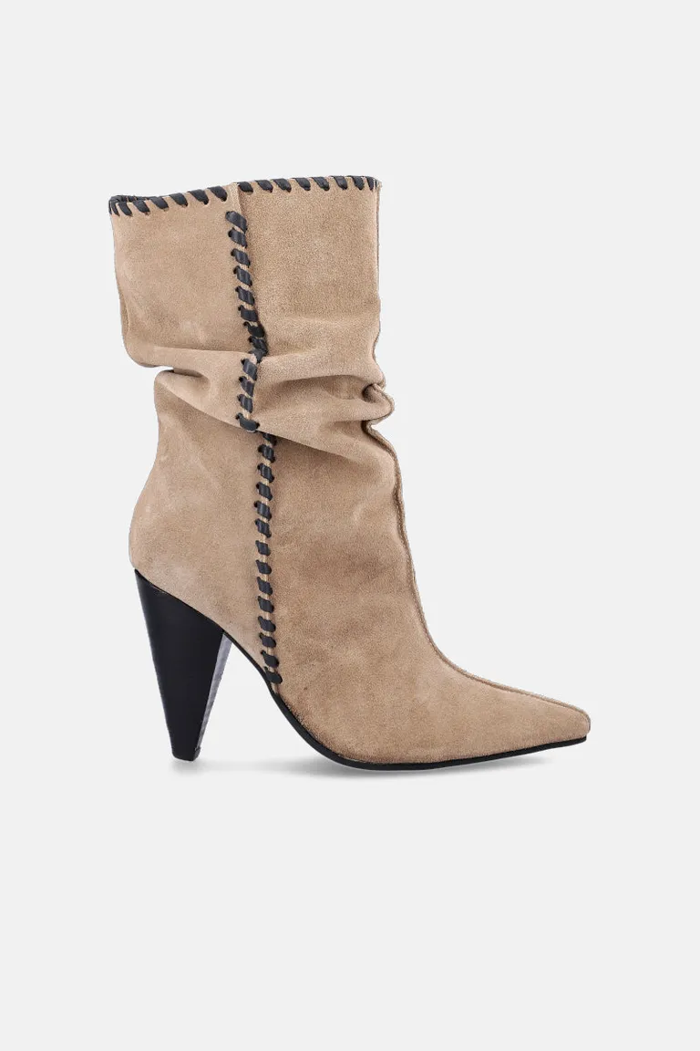 Bota de caña media con diseño de puntera afilada y tacón cónico. Presenta detalles de costuras a la vista que recorren la estructura, aportando un estilo distintivo. Ideal para completar looks urbanos con un toque sofisticado y moderno.