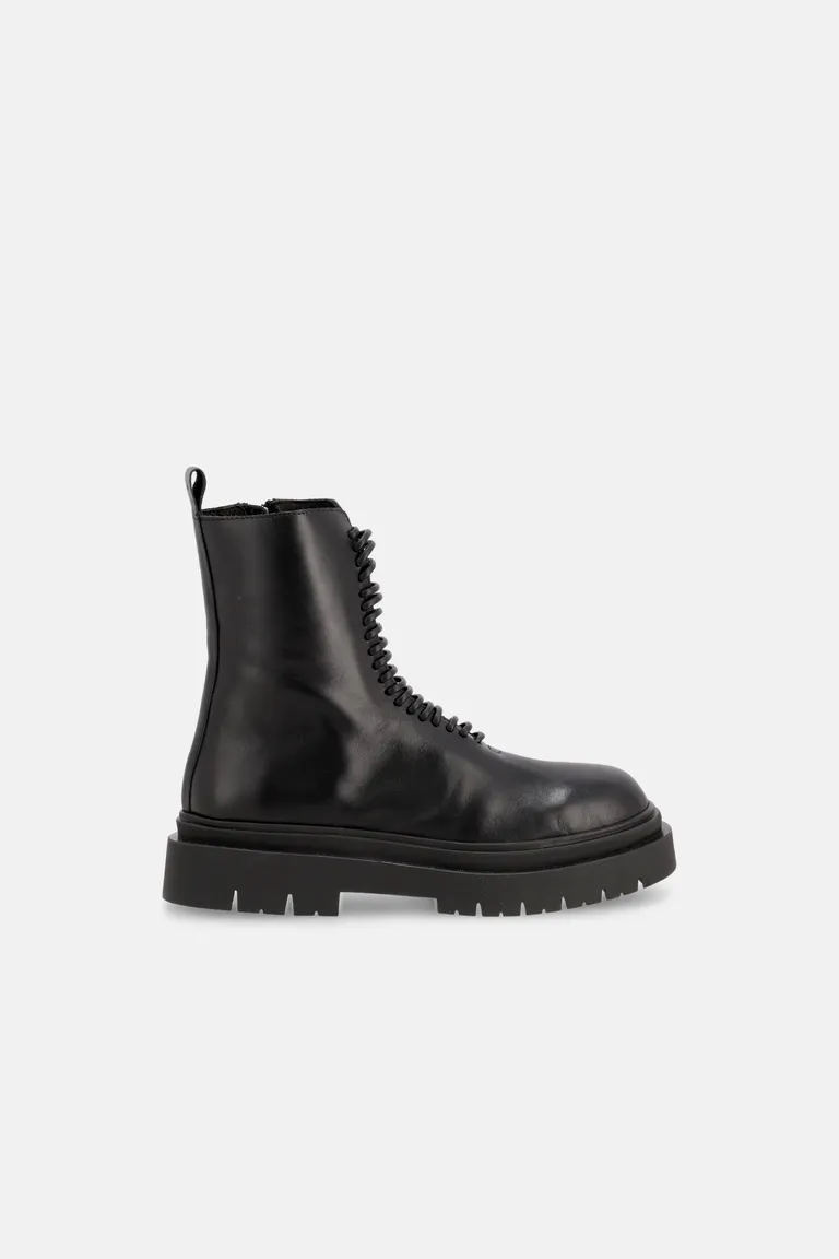 Botas tipo borcego de caña media con cordones frontales y suela de plataforma dentada. Diseño versátil de estilo urbano, con punta redondeada y presilla trasera para facilitar su uso. Ideal para completar outfits casuales con un toque moderno y audaz.