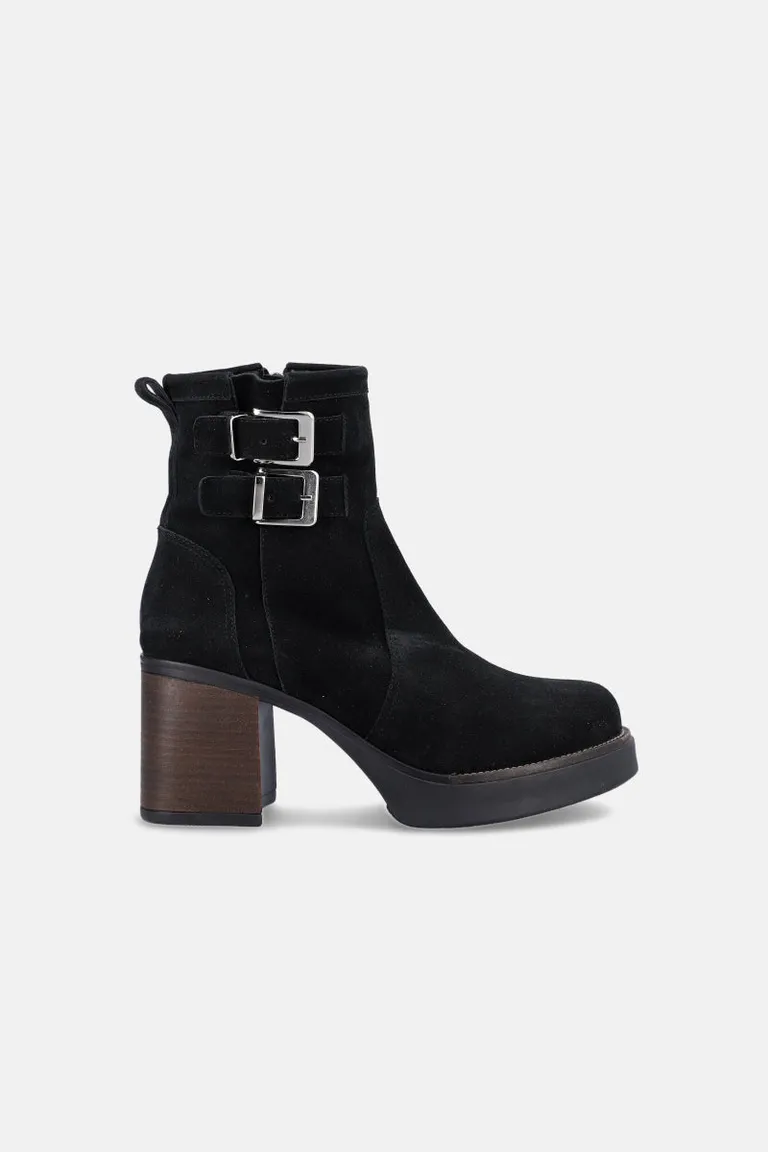 Botín de estilo urbano con inspiración biker y caña media. Presenta dos tiras decorativas con hebillas metálicas en el lateral y una punta redondeada. Su diseño incluye una plataforma delantera y un taco bloque de altura considerable con acabado que simula madera oscura, proporcionando estabilidad y un ajuste cómodo al caminar.