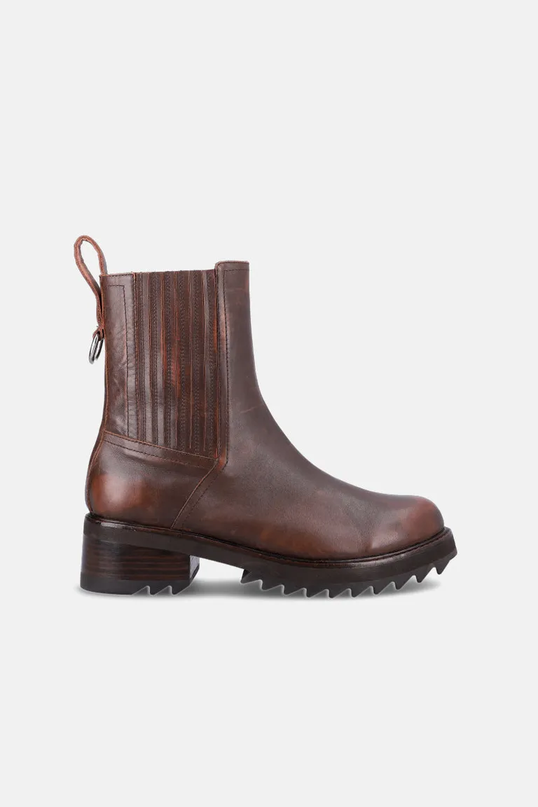 Bota urbana de caña media con paneles laterales elásticos acanalados. Presenta punta redondeada, acabado desgastado y una suela robusta con base dentada que brinda mayor estabilidad. Incluye una tira trasera con detalle de aro metálico para facilitar el calce. Un diseño versátil y cómodo ideal para el uso diario.