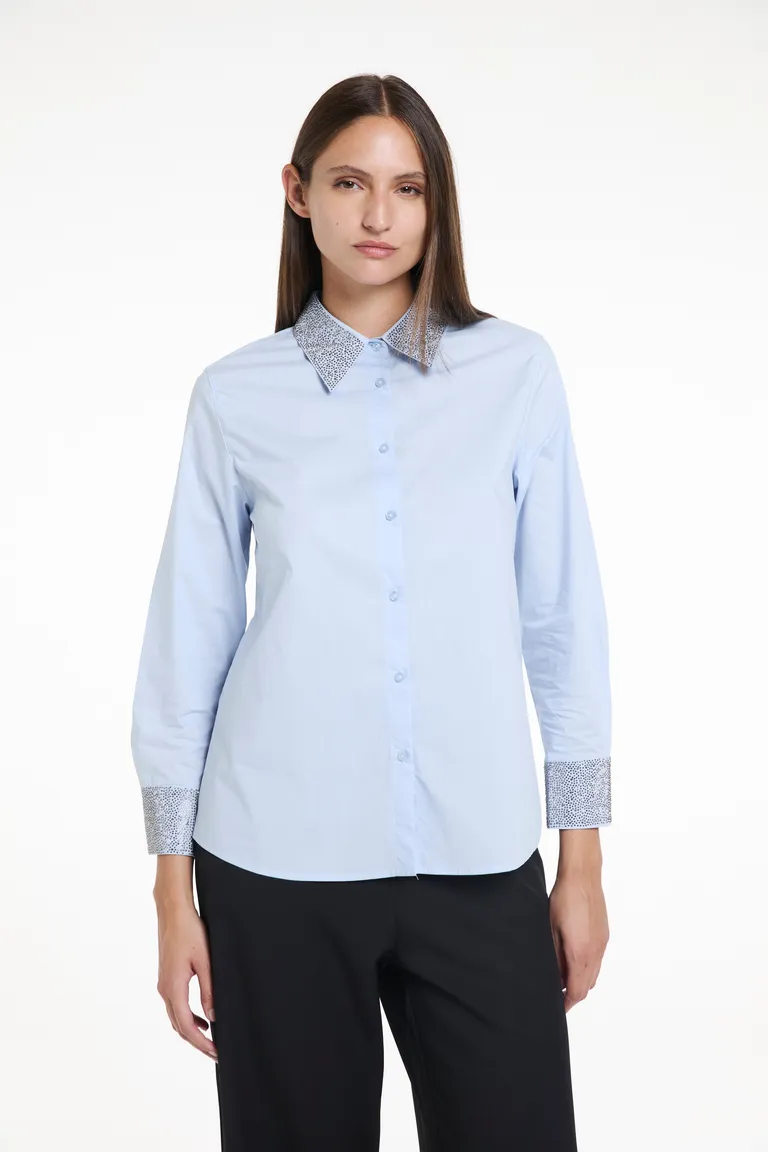 Camisa de corte recto y mangas largas con cierre frontal de botones. Presenta detalles de aplicaciones en cuello y puños que aportan un toque distintivo. Una prenda versátil, ideal para sumar estilo a tus conjuntos diarios o de oficina, ofreciendo un ajuste cómodo y un diseño clásico que se adapta a diversas ocasiones.