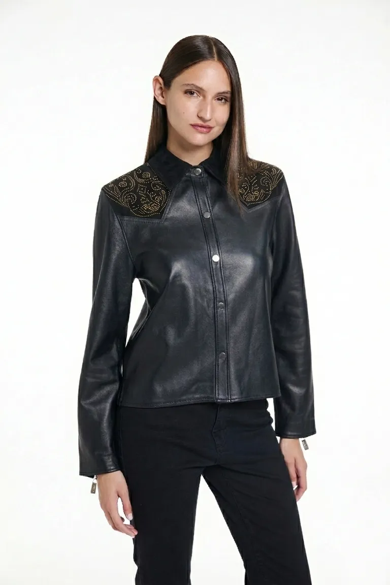 Camisa de diseño western con recortes en los hombros, detalle de calado con aplicaciones metálicas y cierre frontal mediante broches. Una prenda versátil de corte clásico y mangas largas, ideal para completar un look urbano con un toque distintivo.