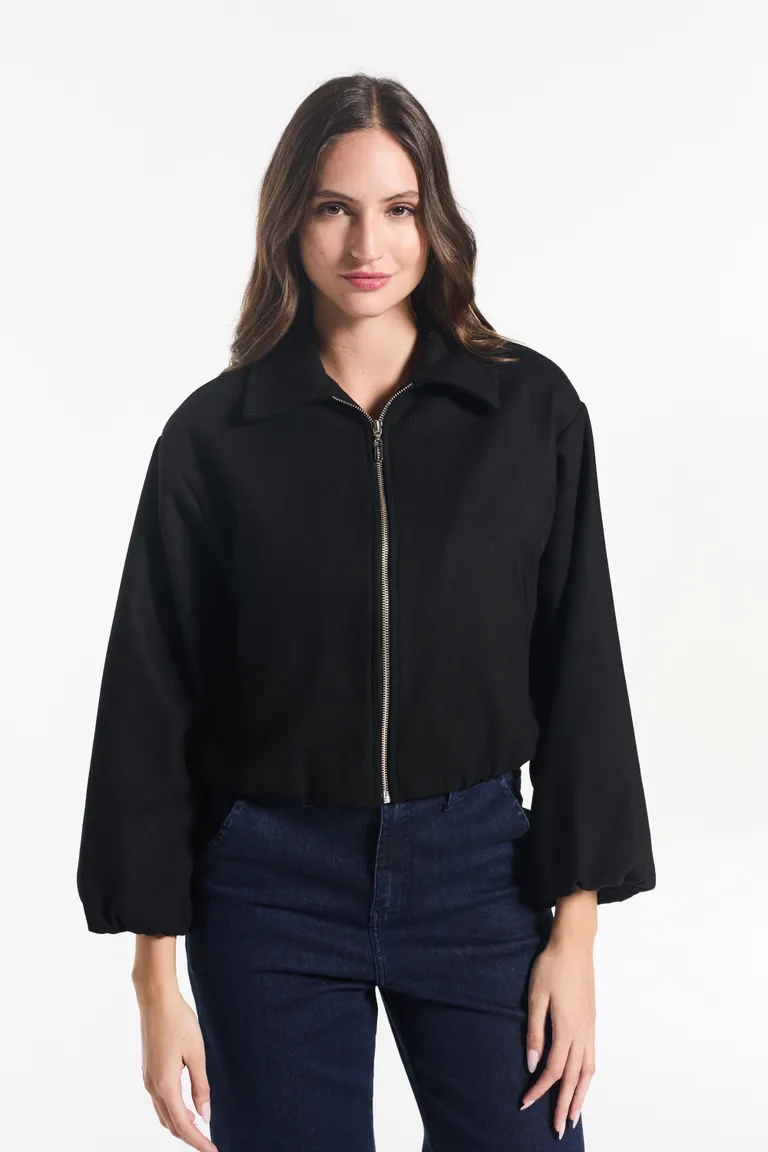 Campera con cuello tipo americano y cierre metálico frontal. Diseño con mangas amplias y largo a la cintura, ideal para completar equipos urbanos y versátiles durante los días frescos de media estación.