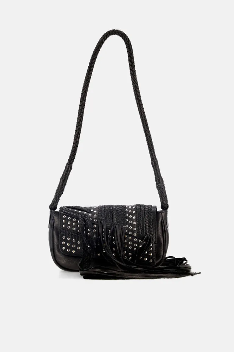 Cartera de tamaño mediano con diseño estructurado, detalle de flecos decorativos y apliques metálicos tipo tachas. Presenta correa larga con acabado trenzado para llevar al hombro. Un accesorio versátil, con cierre superior para mayor seguridad, ideal para complementar outfits diarios con un estilo folk y contemporáneo.
