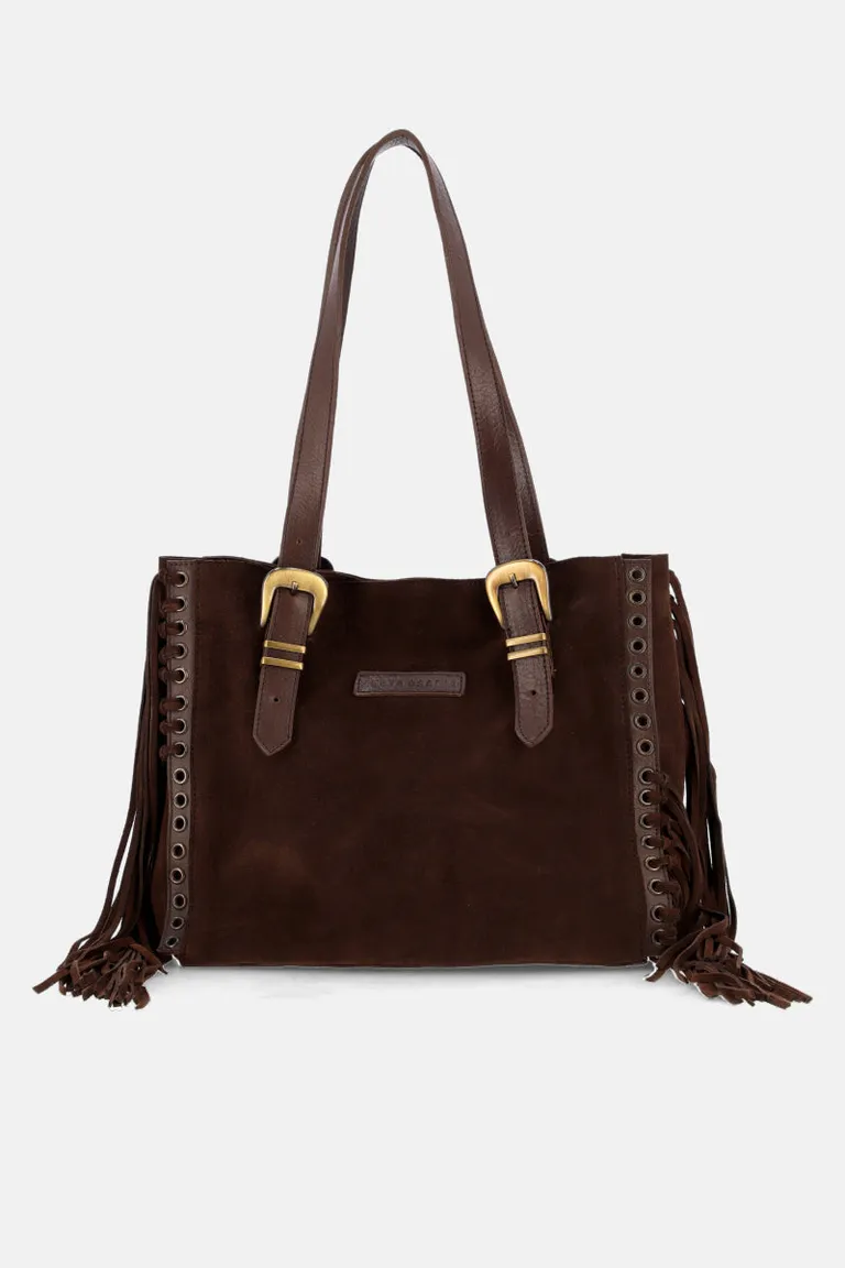 Cartera de estilo boho-chic con flecos laterales y detalles de ojalillos metálicos. Cuenta con manijas reforzadas con hebillas, ofreciendo un diseño estructurado y funcional para el uso diario. El accesorio ideal para sumar personalidad y un toque distintivo a tus outfits urbanos con gran capacidad de guardado.