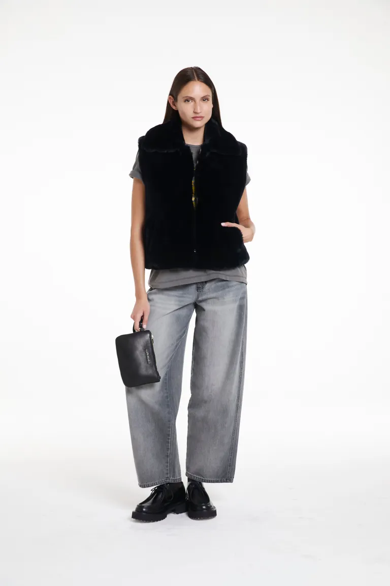 Chaleco sin mangas de textura suave con cierre frontal. Presenta un diseño de calce cómodo y funcional, ideal para combinar en capas durante los días más frescos. Esta prenda aporta un toque distintivo a tus conjuntos diarios, destacándose por su versatilidad y practicidad en el uso cotidiano.
