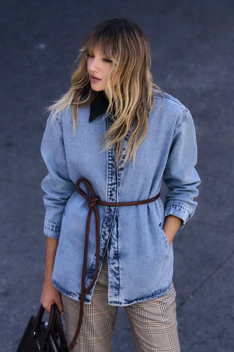 Chaqueta tipo sobrecamisa con corte holgado y diseño versátil. Esta prenda cuenta con un estilo urbano ideal para combinar en diversos outfits diarios, aportando una capa extra de abrigo liviano y un ajuste moderno gracias a su lazo en la cintura. Presenta una silueta relajada y funcional perfecta para transiciones de temporada, destacándose por su estructura clásica y detalles en las costuras.