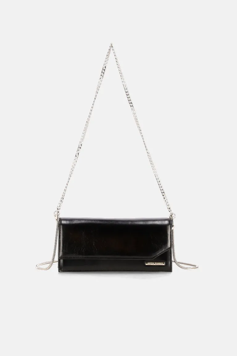 Mini bag de diseño compacto ideal para completar outfits de noche o eventos formales. Presenta una estructura rígida con solapa frontal y detalle de cadena metálica desmontable que permite usarla al hombro o como bolso de mano. Su formato versátil y elegante es perfecto para llevar los esenciales con estilo y comodidad en cualquier ocasión.