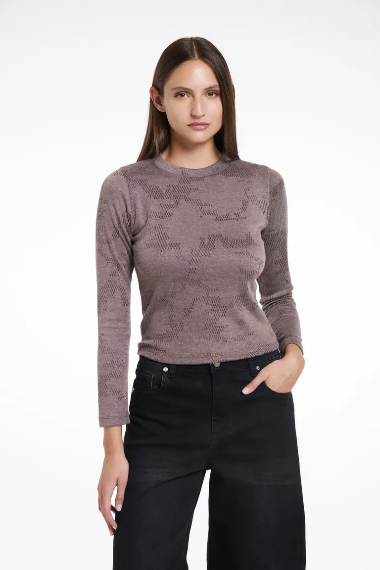 Sweater femenino de manga larga con diseño jacquard calado. Presenta un corte ajustado y cuello redondo, ideal para lograr un estilo versátil y refinado. Una prenda esencial de textura liviana para complementar todo tipo de conjuntos diarios con elegancia y comodidad.