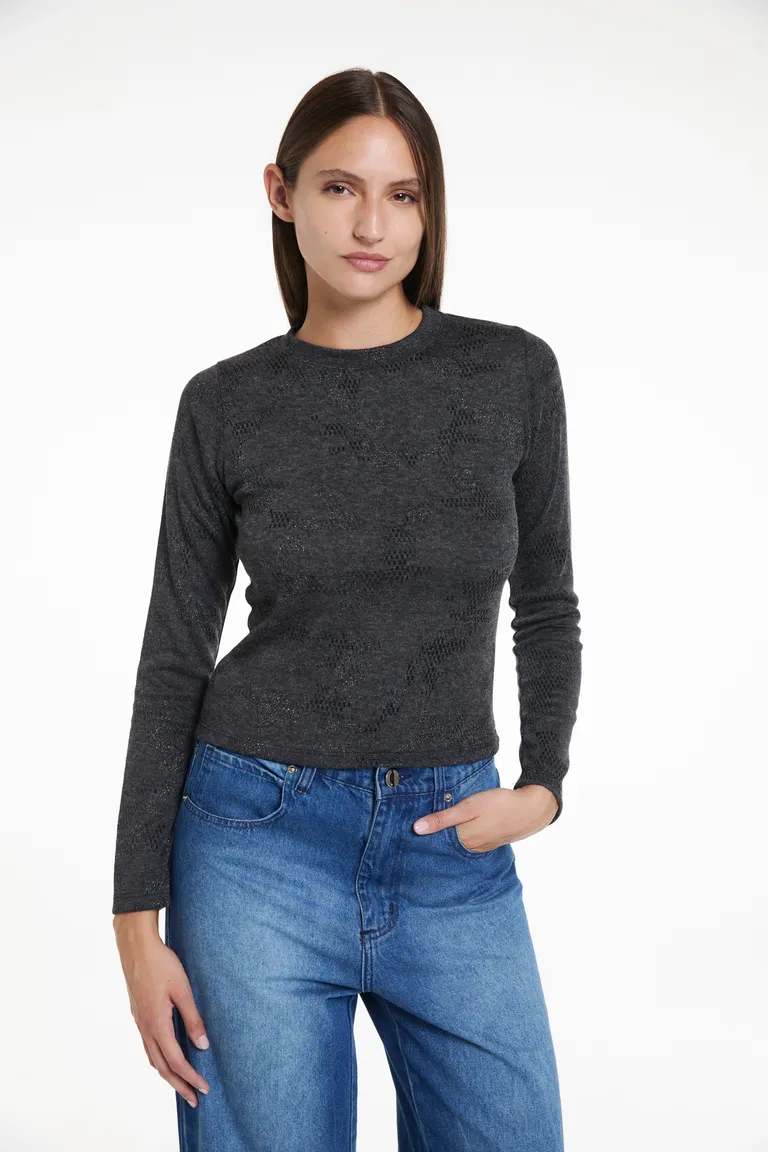 Sweater de manga larga con diseño jacquard calado y silueta ajustada. Una prenda versátil de cuello cerrado, ideal para completar equipos informales con jeans o combinar con pantalones de vestir para una propuesta urbana.
