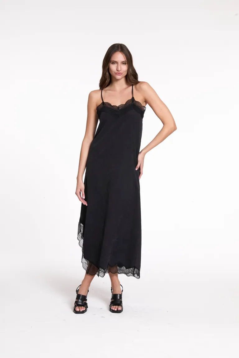 Vestido tipo lencero con detalles de encaje en el escote y el ruedo. Presenta un corte midi con abertura lateral, ideal para crear estilismos elegantes y versátiles para diversas ocasiones.