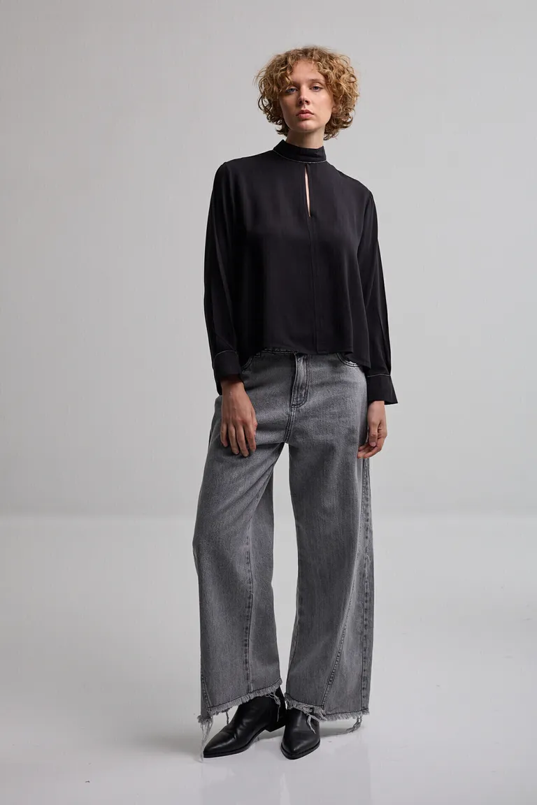 Blusa de mangas largas con cuello alto y detalle de abertura frontal. Presenta un corte fluido y elegante, ideal para completar outfits versátiles en cualquier ocasión. Su diseño minimalista y sofisticado permite combinarla fácilmente con diferentes prendas inferiores para lograr un look distinguido.
