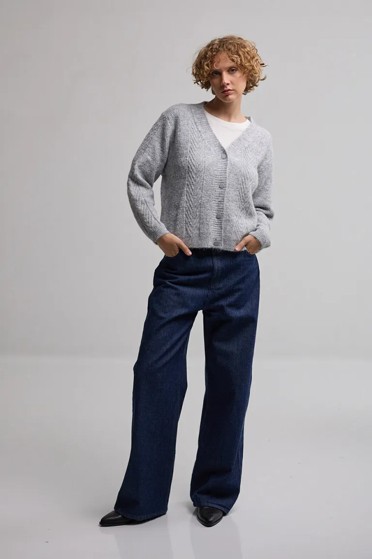 Cardigan de corte recto con escote en V y cierre frontal mediante botones al tono. Presenta un tejido con detalle de textura de ochos, ideal para combinar en looks diarios. Su diseño versátil alcanza la altura de la cadera, ofreciendo una opción clásica y funcional para diversas ocasiones.