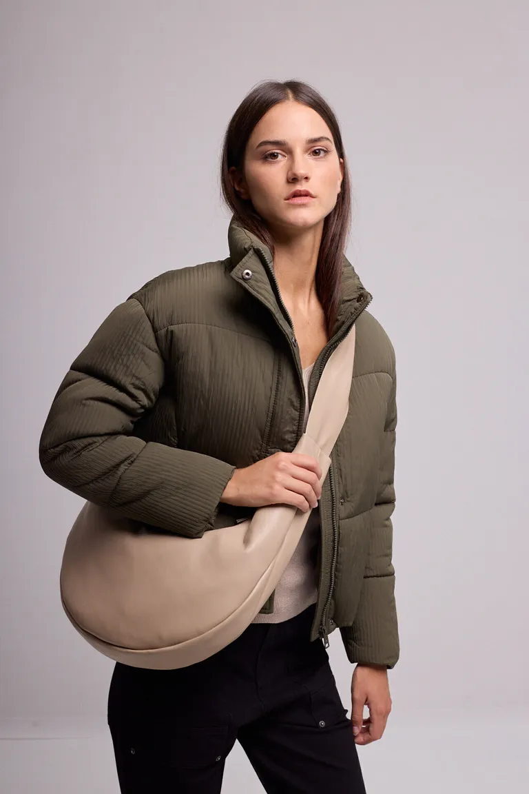 Cartera tipo hobo con diseño de silueta curva y correa ancha integrada. Este accesorio presenta un estilo minimalista ideal para completar looks urbanos y modernos. Cuenta con un compartimento principal espacioso para el guardado de objetos personales, combinando funcionalidad y diseño contemporáneo. Su acabado suave y estructura versátil la convierten en una pieza esencial para el uso cotidiano.